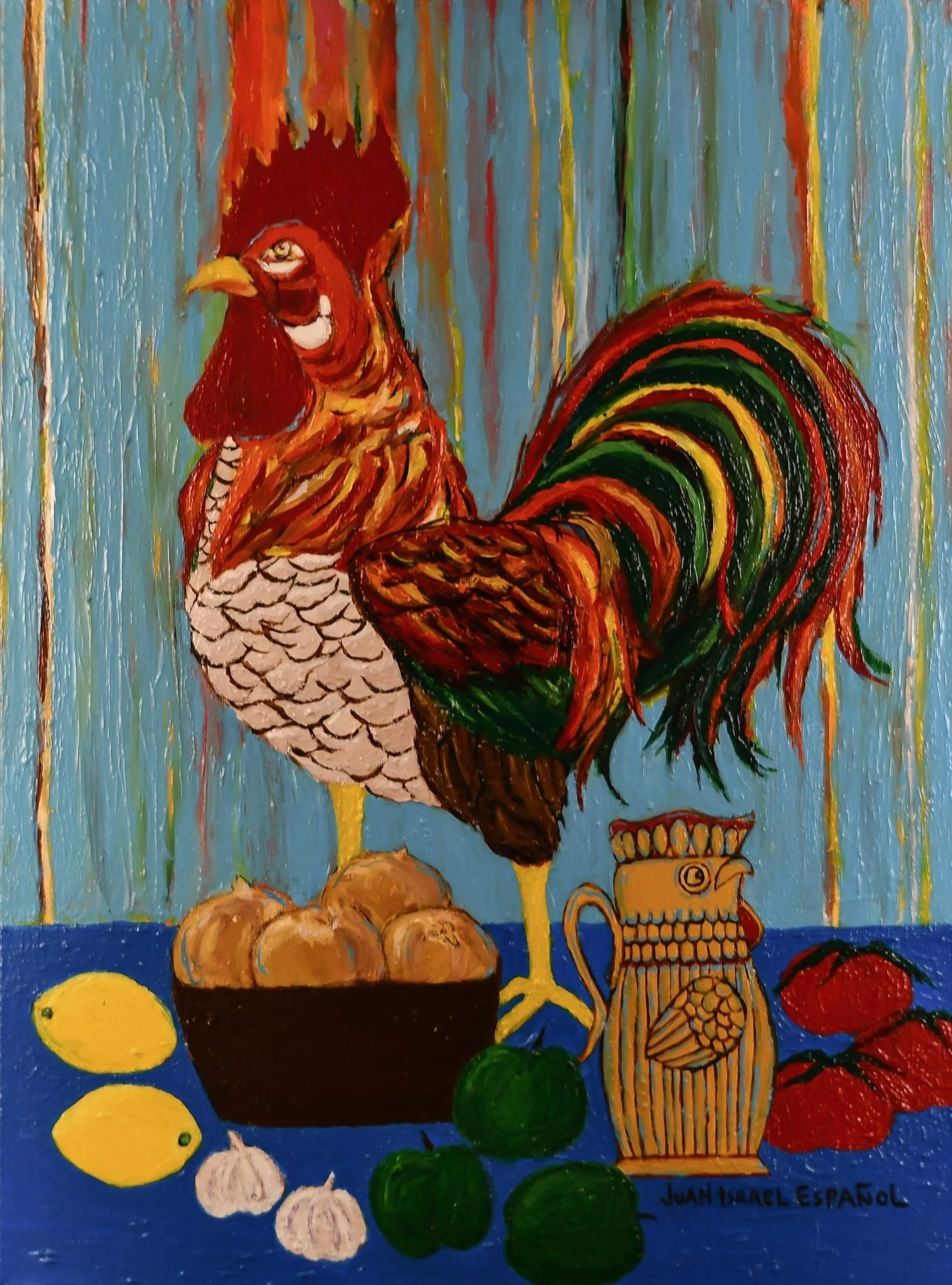 Rooster on table. Acrylic paint on canvas. 18”x24”. Private collection.