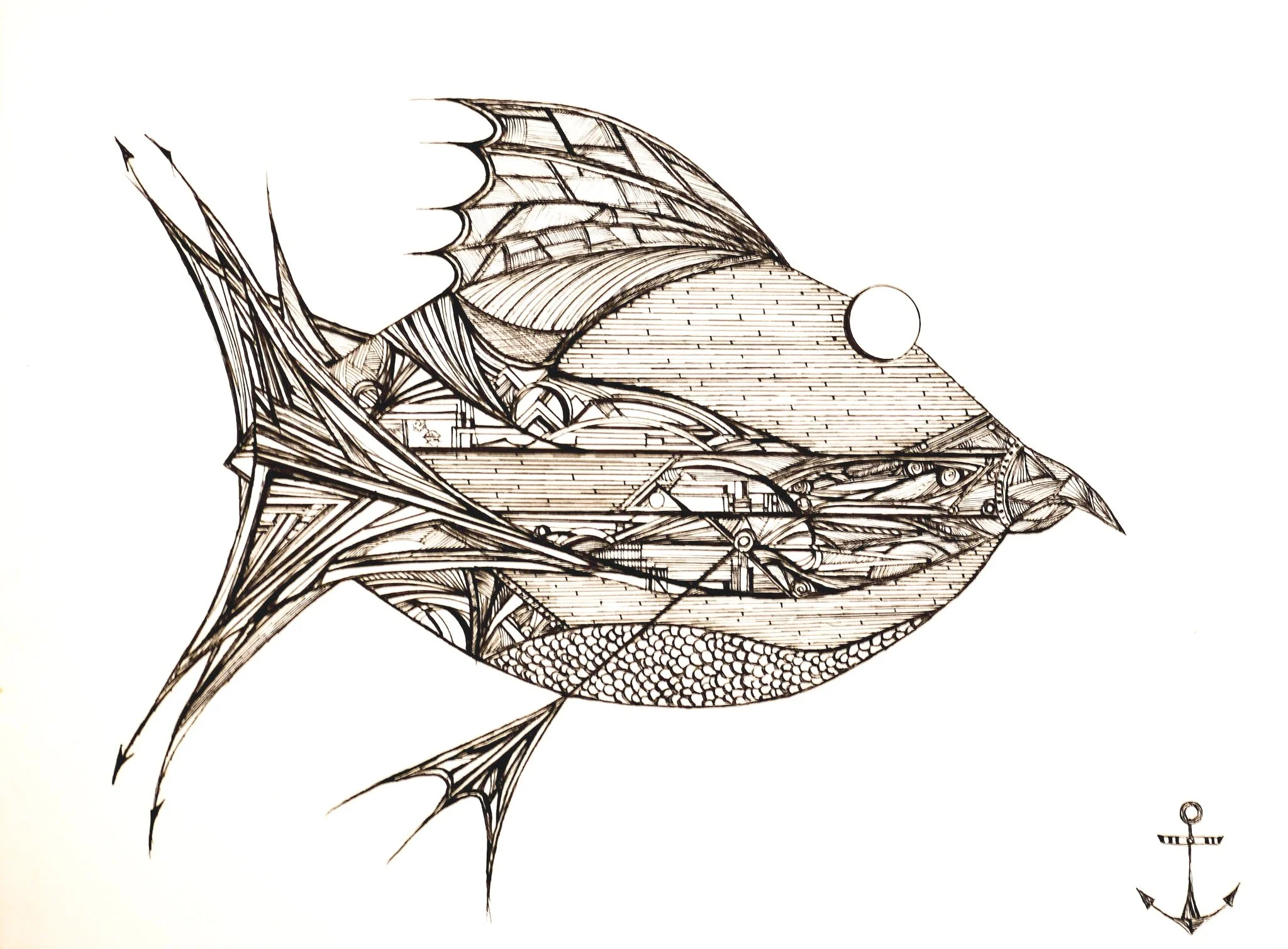 Mechanical Fish, Ink on Bristol Paper. 8.5”x11.5”.